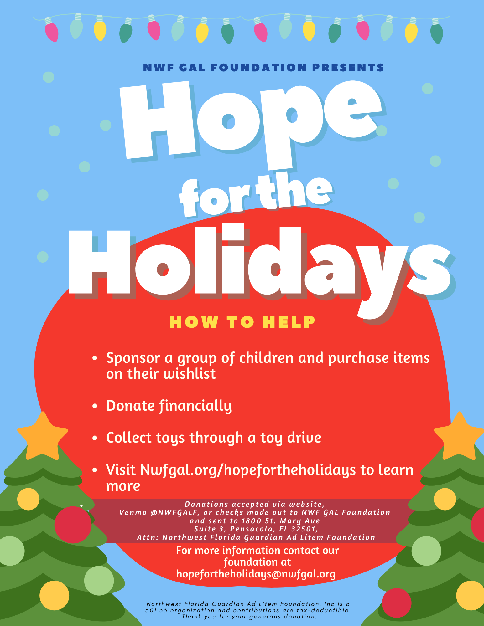 Click below to receive the latest updates on how you can provide Hope for the Holidays for our GAL children or contact Board Director Abigail Farrington at afarringtongal@gmail.com